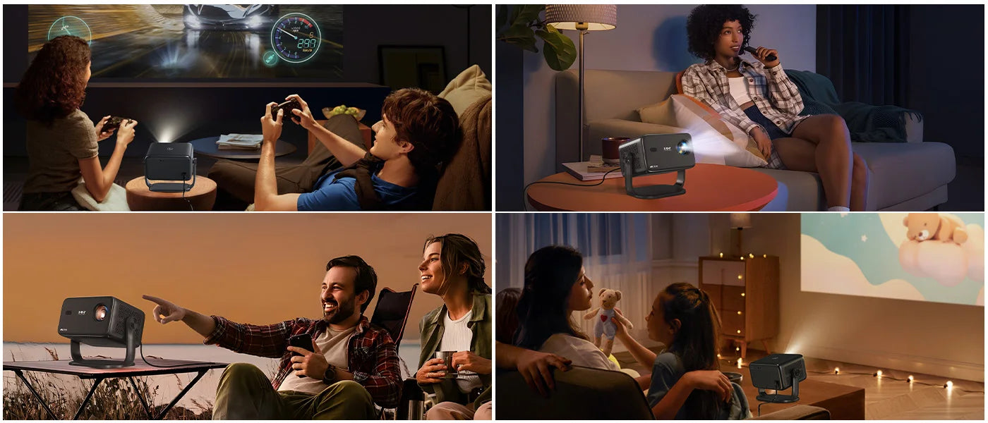 Profitez d’une flexibilité totale grâce à la conception rotative à 180° : projetez sur n’importe quelle surface, y compris le plafond, et regardez vos films allongé confortablement dans votre lit. Avec une taille d’écran réglable de 40 à 120 pouces, créez une véritable ambiance cinéma dans votre salon, votre chambre ou même en extérieur.