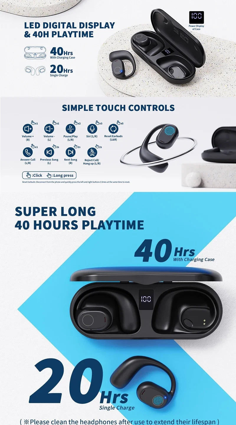 UYUXIO Écouteurs à Conduction Ouverte Bluetooth 6.0 Sans Fil – Écouteurs de Sport avec Affichage Numérique, 40 Heures d’Autonomie, Idéals pour les voyages.